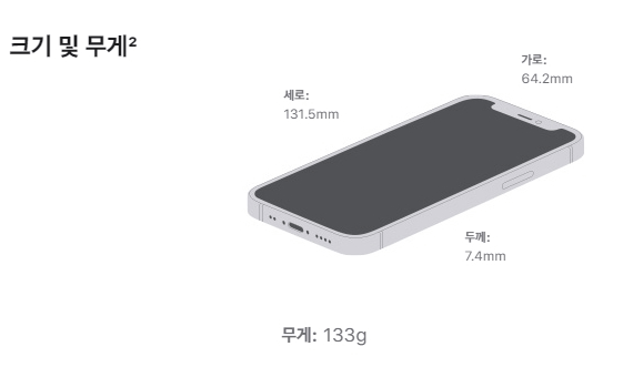아이폰12 미니: 가로 64.2mm 세로 131.5mm 두께는 7.4mm이며 무게는 133g입니다.