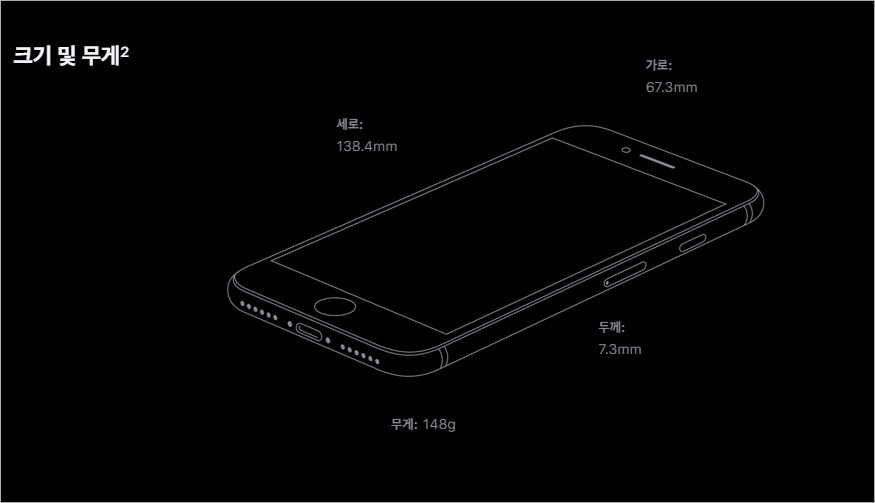 아이폰se2: 가로 67.3mm 세로 138.4mm 두께는 7.3mm이며 무게는 148g입니다.