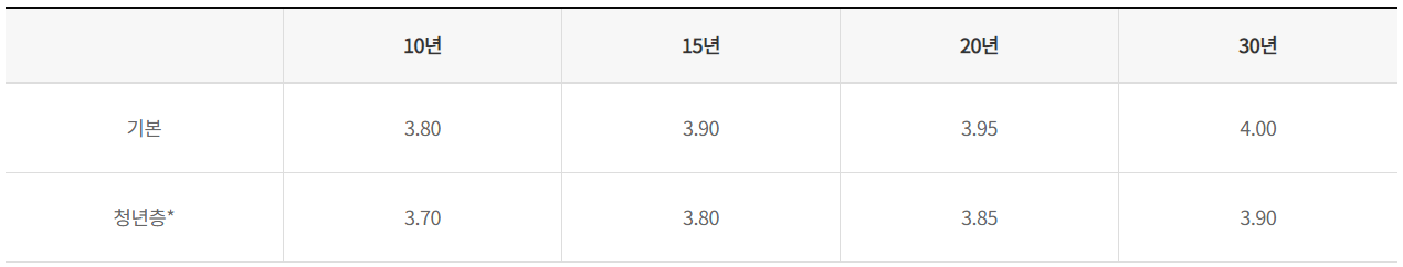 만 39세 이하의 청년층에게는 0.1%의 우대금리가 적용되며 기본 3.8~4%의 고정 금리입니다. 대출 기간은 10년, 15년, 20년, 30년 중 선택 가능하며 만기가 길수록 DTI는 낮아집니다.