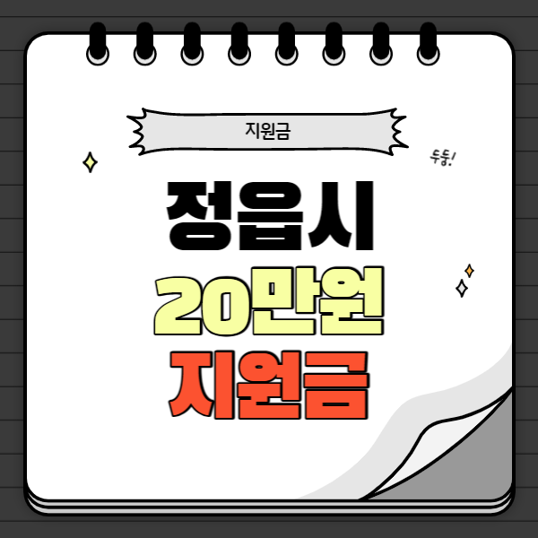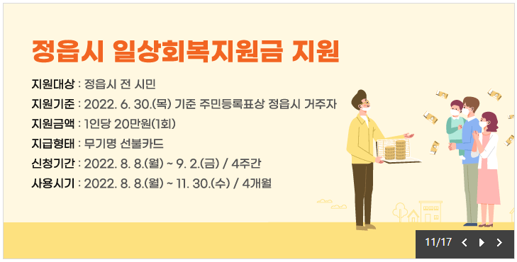6월 30일 기준 주민등록상 정읍 시민이라면 정읍시 재난지원금 신청 대상입니다. 8월 8일부터 9월 2일까지 지원금 신청 기간이며 20만원씩 무기명 선불카드로 지원금을 지급 받습니다.